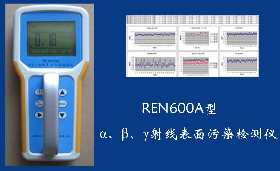 REN600A 表面沾污檢測儀REN600A型α、β、γ射線表面污染檢測儀即可檢測α、β、γ射線,也能檢測到X射線,它采用高速嵌入式微處器作為數據處理單元,點陣式大屏幕LCD液晶顯示,讀數清晰、操作方便,具有400條超大容量數據存儲。儀器采用進口的大面積MICA蓋革探測器,具有較高探測效率,可進行α、β輻射表面污染檢測和X、γ輻射劑量率的監測。此外通過配套的RenriCont表面污染管理軟件可將存儲的數據讀出后分析。可廣泛用在制藥廠、實驗室、發電廠、進出口商檢、采石場、環境實驗室、環境污染調查、核安全應急、緊急狀況營救站、金屬處理廠、地下油田、供油管道裝備、醫院核醫學科、同位素實驗室、環境保護和警察局等部門。REN600A型α、β、γ射線表面